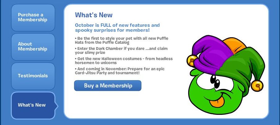 Club Penguin has updated the what's new page! It tells us what is going to happen this month in October and a sneak peek of November!